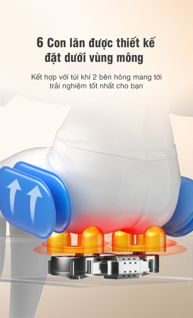 6 con lăn được thiết kế đặt dưới vùng mông, kết hợp với túi khí 2 bên hông giúp bạn được massage toàn thân và thư giãn tối đa.